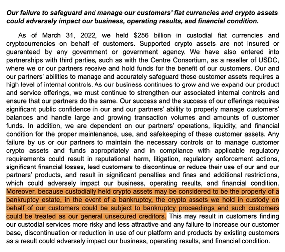 "Because custodially held crypto assets may be considered to be the property of a bankruptcy estate, in the event of a bankruptcy, the crypto assets we hold in custody on behalf of our customers could be subject to bankruptcy proceedings and such customers could be treated as our unsecured creditors."